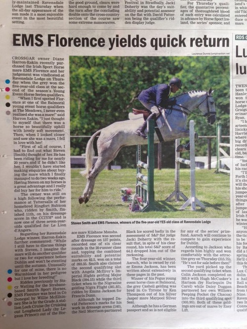 Well done to EMS Florence and Steven Smith winning the 5yo section @ Ravensdale on Thursday - produced and recently sold by Smyth Sport Horses! Wishing her the very best of luck in the RDS!